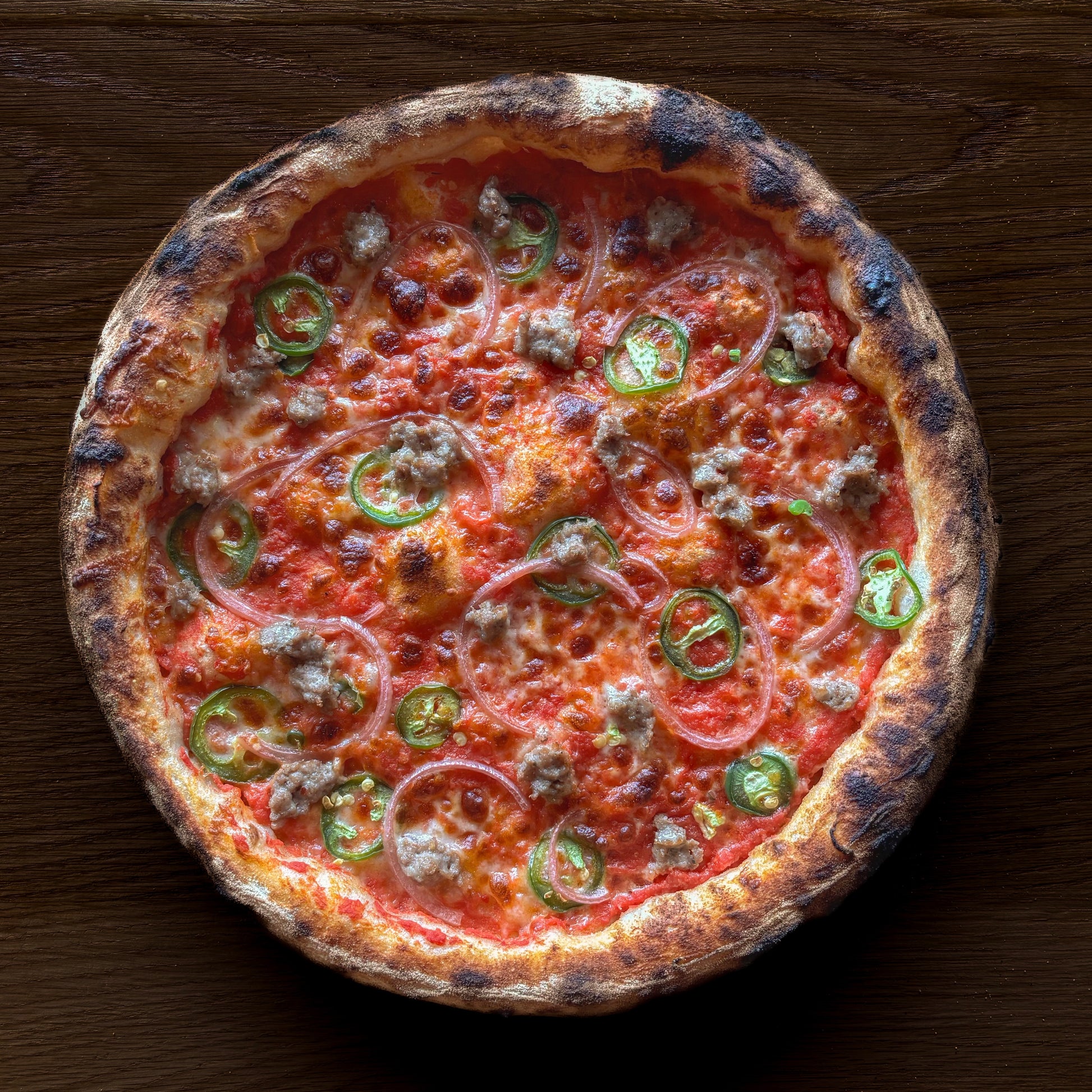 tomato base, mozzarella, Italian sausage, pickled red onions, jalapenos